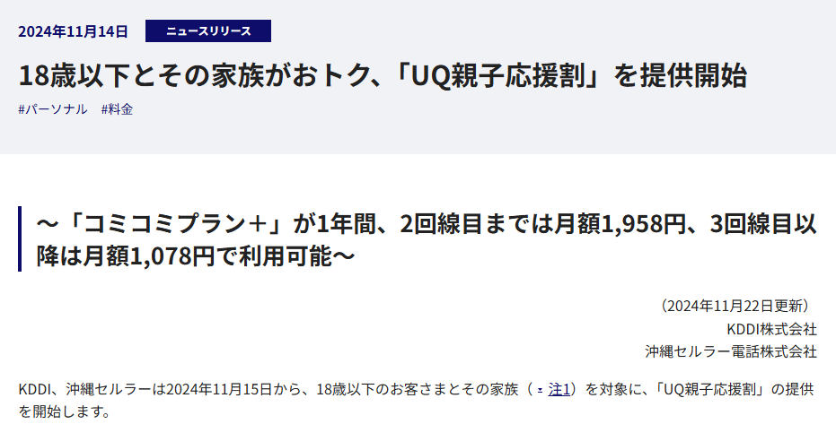 2025年11月21日、2025年-2026年版のUQモバイルの学割にあたる「UQ親子応援割」の新規受付が開始されました。