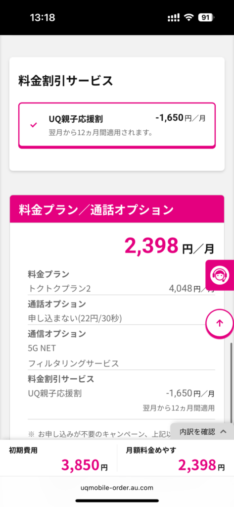 利用者に18歳以下の方の情報を入力できていたら、UQ親子応援割は契約翌月から自動適用になります。
