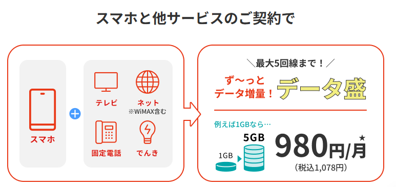 データ容量ごとに5つのプランが提供されていますが、J:COMの各種サービスを契約していると「データ盛」が適用される、コスパが良くなる点がJ:COM MOBILEの大きな特徴となります。