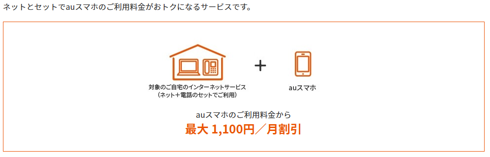- 自宅のネットとセットにするとauスマホの月額料金から最大1,100円/月割引