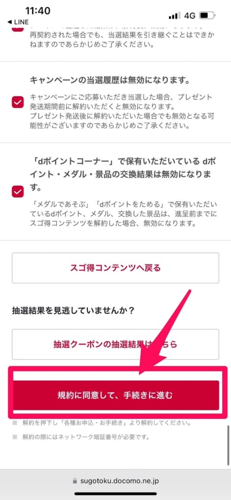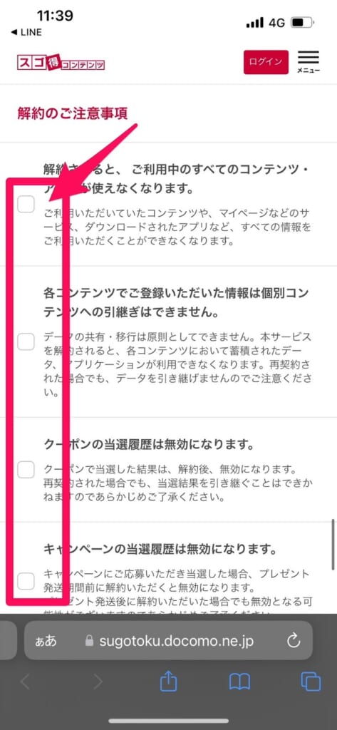 その後、解約時の注意事項が表示されるので目を通して「解約のご注意事項」全てにチェックをいれてください。