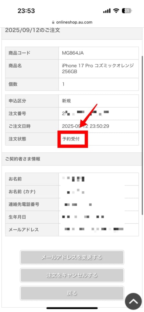 auでiPhone 17を予約した後は、メールアドレス・連絡先電話番号のみ変更が可能です。