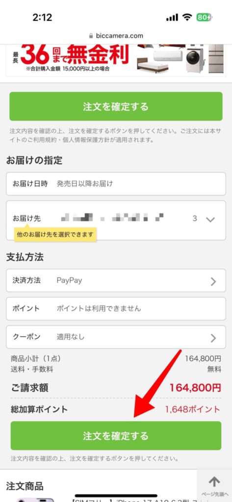 ※「ヨドバシカメラ店舗受け取り」か「自宅配送」でボタンが分かれているので注意しましょう。