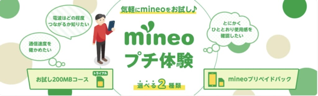 mineoプチ体験では月額330円(税込)からmineoのドコモ回線・au回線・ソフトバンク回線が試せるサービスで200MBのデータ量が最大2カ月の期間で利用できるサービスを実施中です。