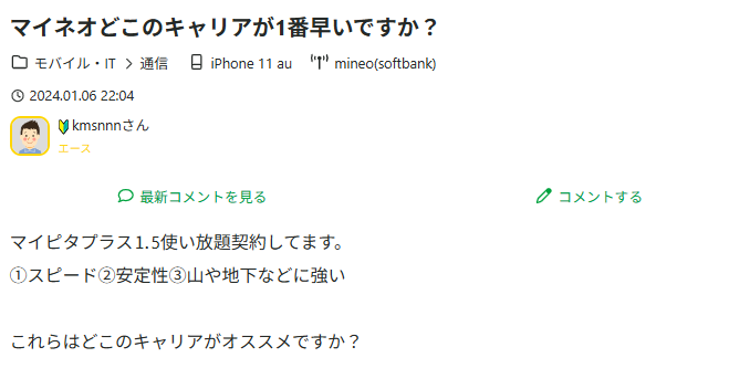 ドコモ、au、ソフトバンクの3回線の口コミについては、mineo公式のファンサイトコミュニティである「マイネ王」から一部を抜粋したいと思います。各回線をチェックして、比較の材料にして頂ければと思います。