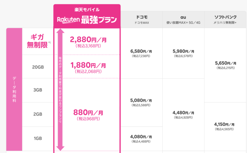 「最強家族プログラム」を適用した場合、Rakuten最強プラン3GBまでの利用なら、月額968円〜利用できます。